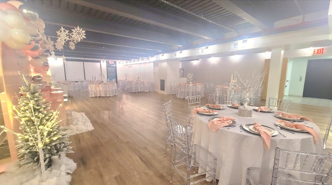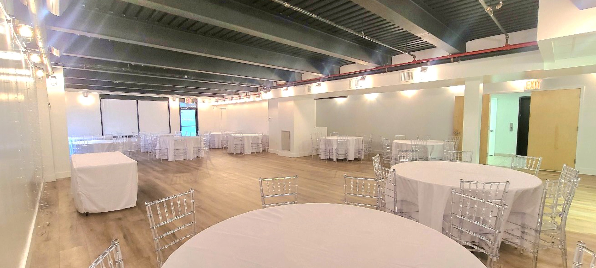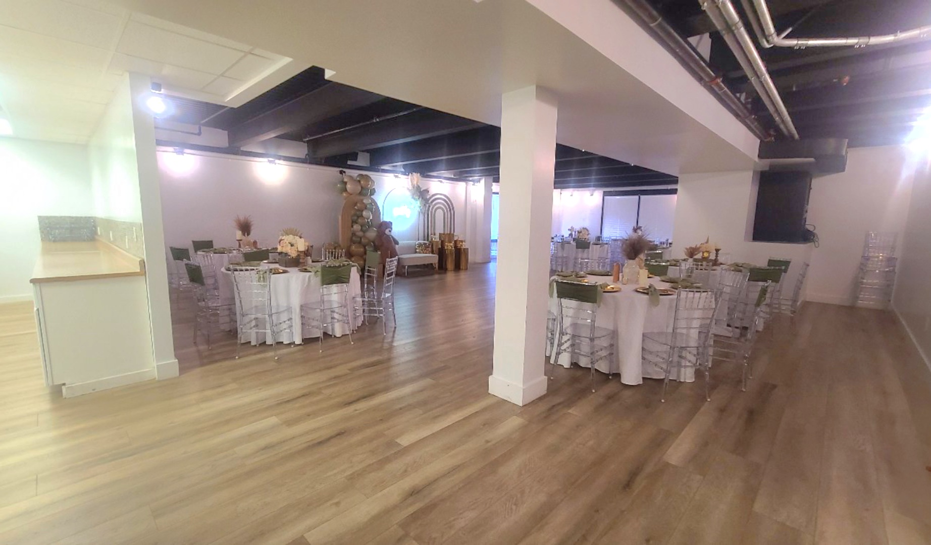 The location hosts up to 80 guests. Food, decor, soft beverages and entertainment not provided in this winning. The event space provides the tables, chairs, parking, two restrooms, kitchenette no stove but with ten wire racks, two coolers, fridge, extra large counter space with sink, one security personnel and cleanup.
